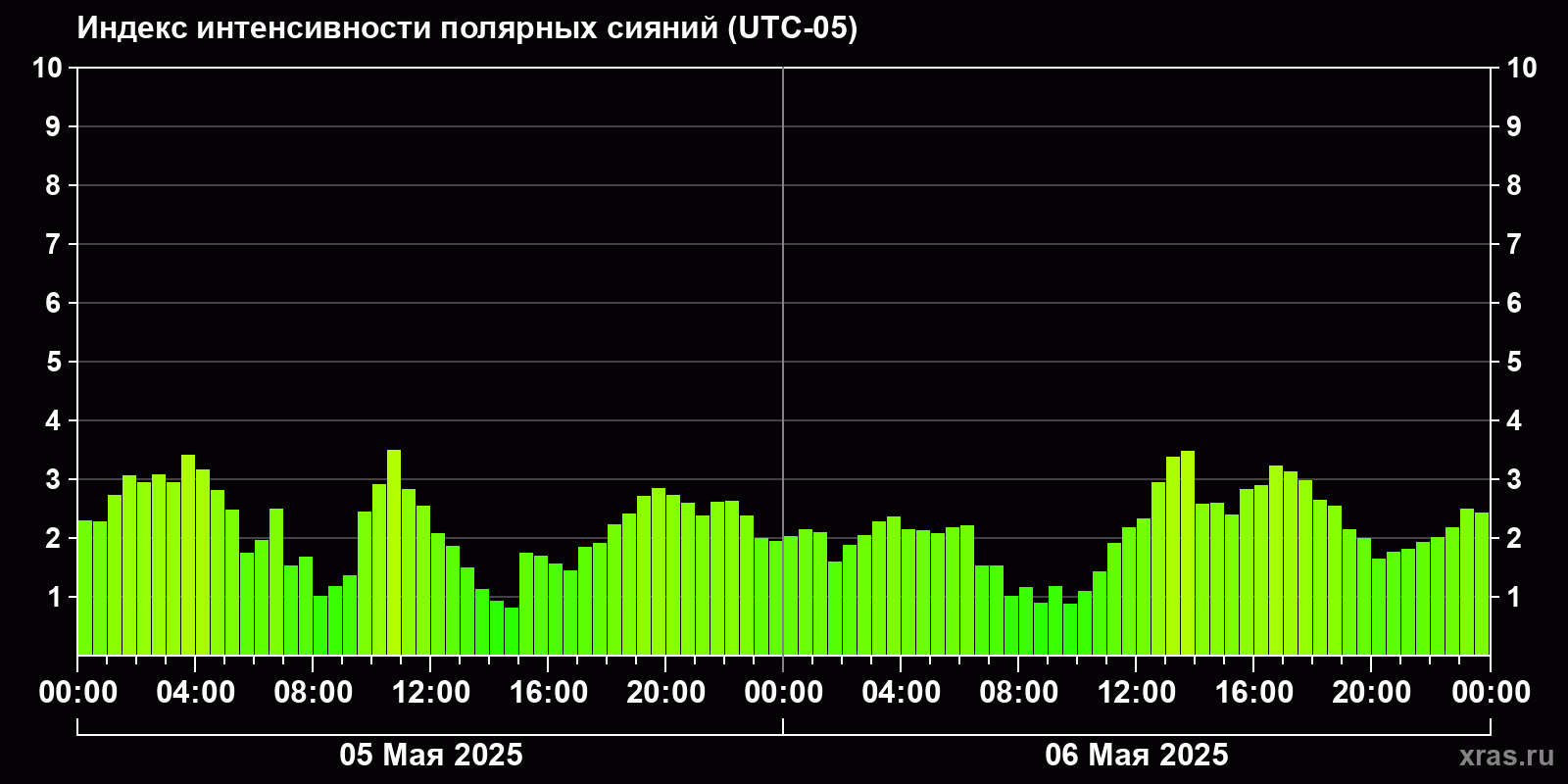 Изменения индекса интенсивности полярных сияний с 2025-05-05 по 2025-05-06 по местному времени