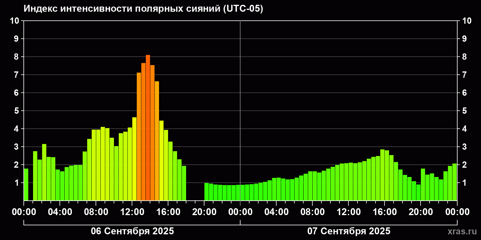 Изменения индекса интенсивности полярных сияний с 2025-09-06 по 2025-09-07 по местному времени