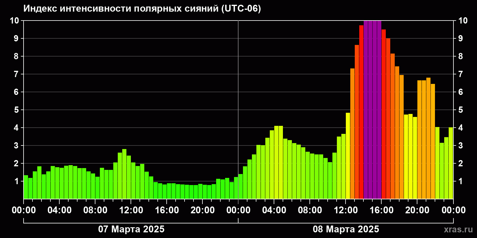 Изменения индекса интенсивности полярных сияний с 2025-03-07 по 2025-03-08 по местному времени