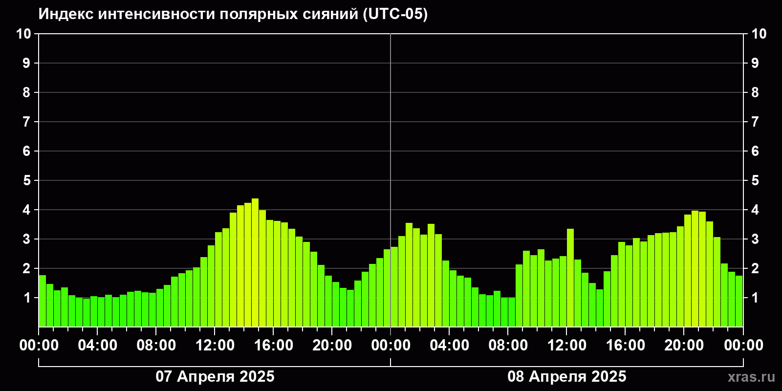 Изменения индекса интенсивности полярных сияний с 2025-04-07 по 2025-04-08 по местному времени