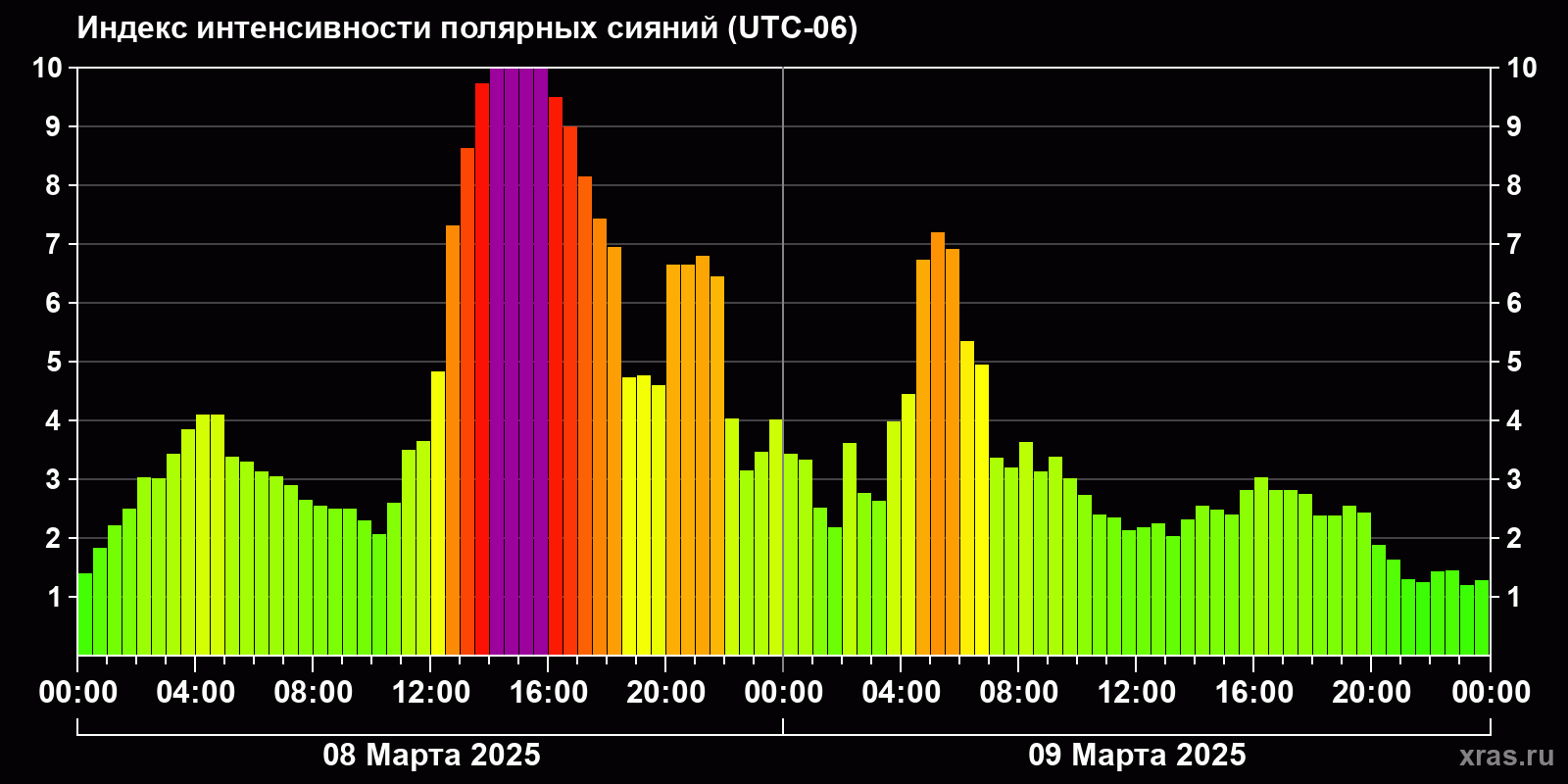 Изменения индекса интенсивности полярных сияний с 2025-03-08 по 2025-03-09 по местному времени