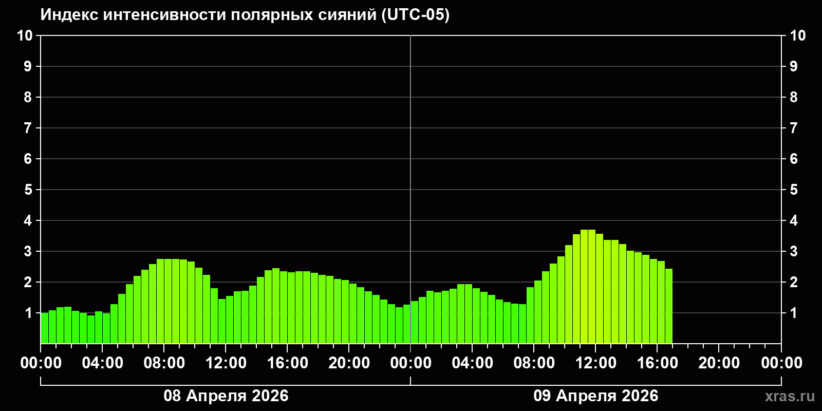 Изменения индекса интенсивности полярных сияний с 2026-04-08 по 2026-04-09 по местному времени