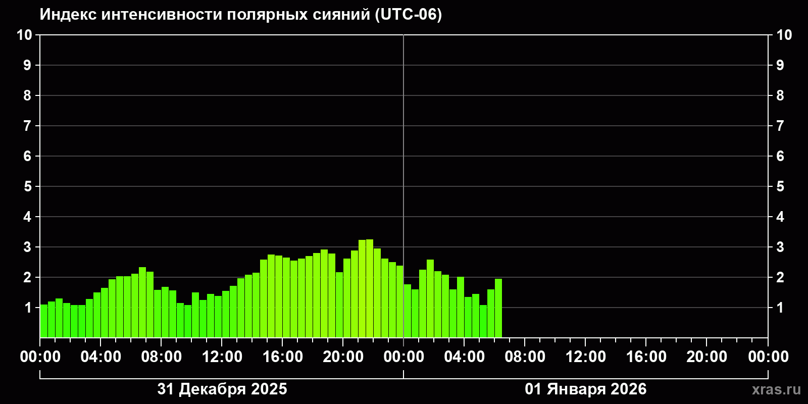 Изменения индекса интенсивности полярных сияний с 2025-12-31 по 2026-01-01 по местному времени