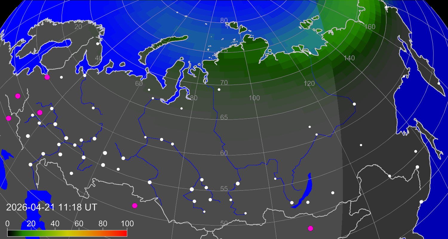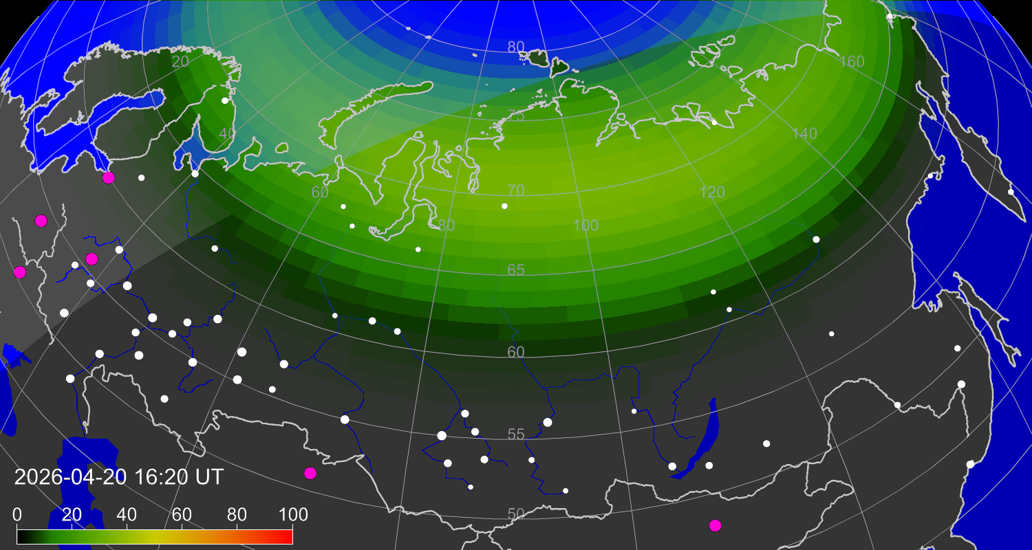 Вероятность полярных сияний в городах Российской Федерации