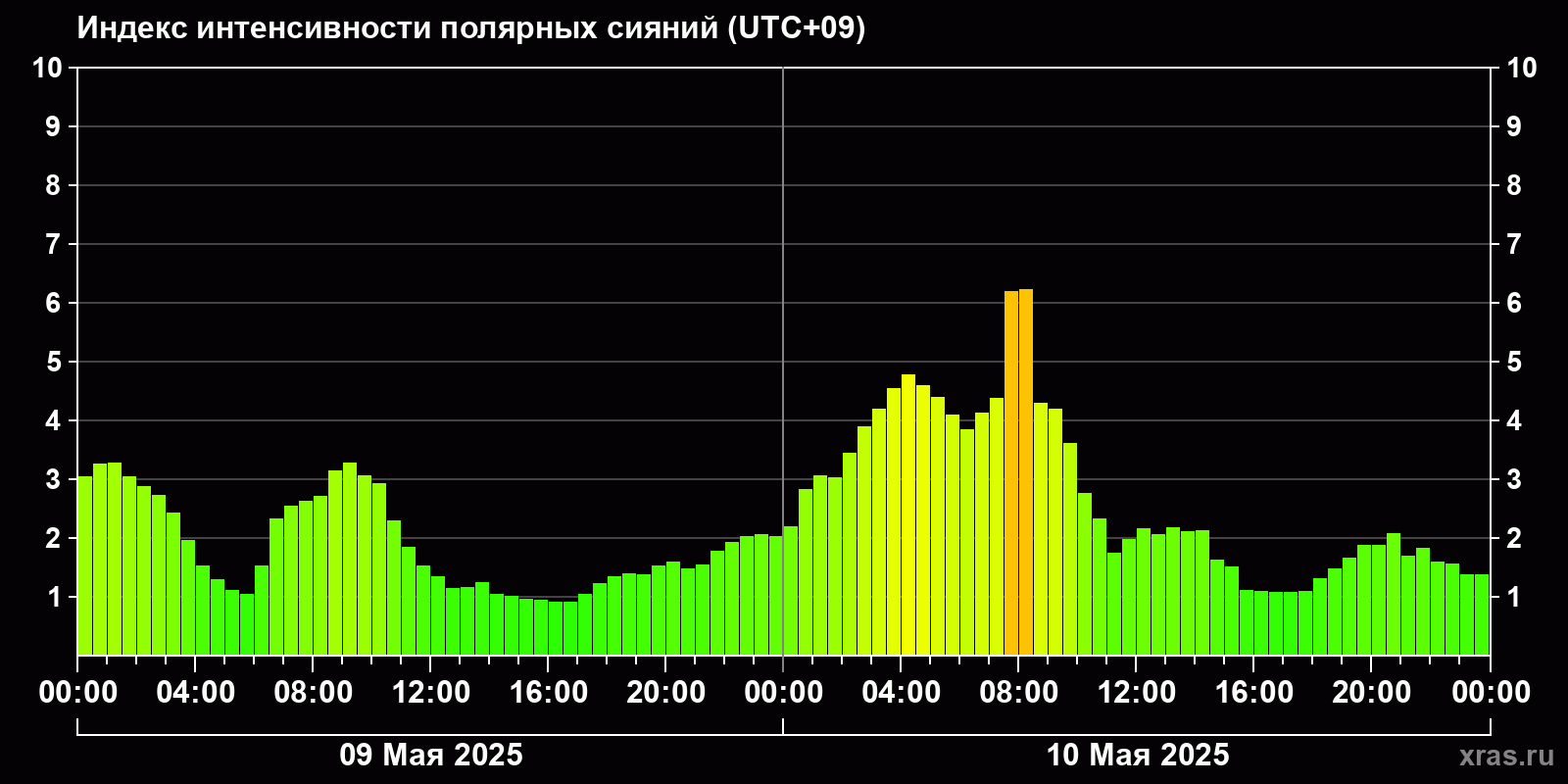 Изменения индекса интенсивности полярных сияний с 2025-05-09 по 2025-05-10 по местному времени