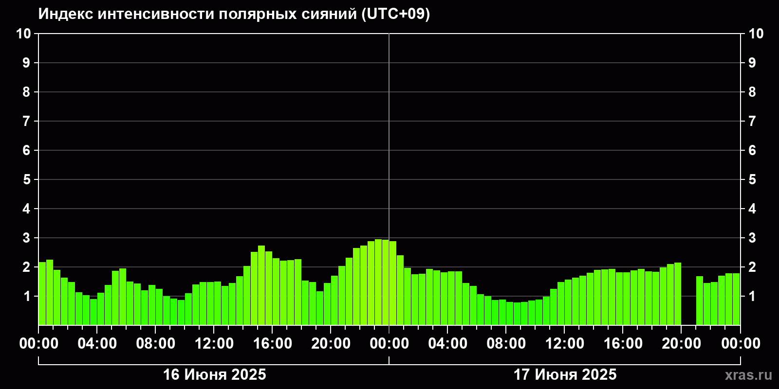 Изменения индекса интенсивности полярных сияний с 2025-06-16 по 2025-06-17 по местному времени