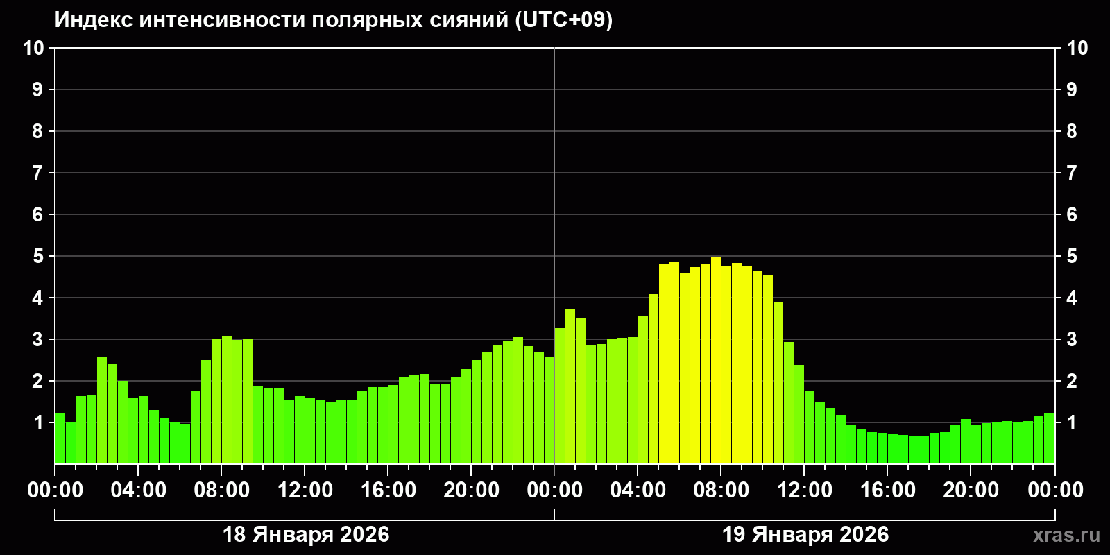 Изменения индекса интенсивности полярных сияний с 2026-01-18 по 2026-01-19 по местному времени