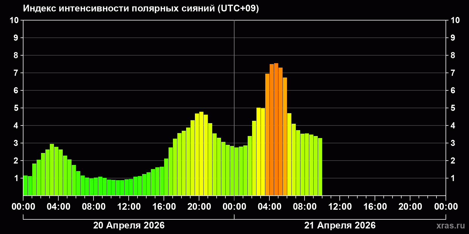 Изменения индекса интенсивности полярных сияний с 2026-04-20 по 2026-04-21 по местному времени