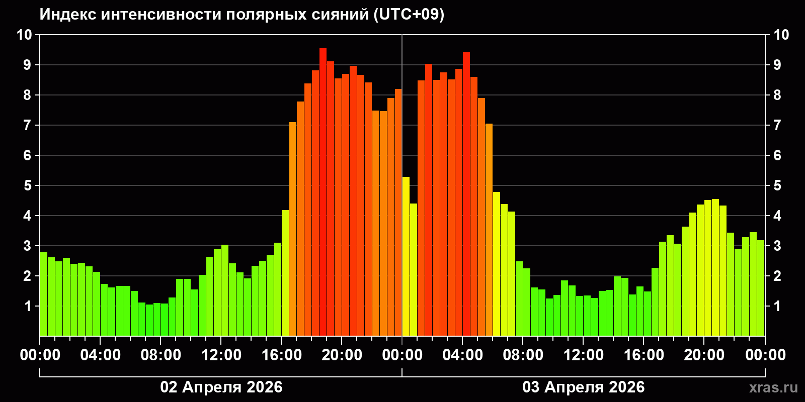 Изменения индекса интенсивности полярных сияний с 2026-04-02 по 2026-04-03 по местному времени