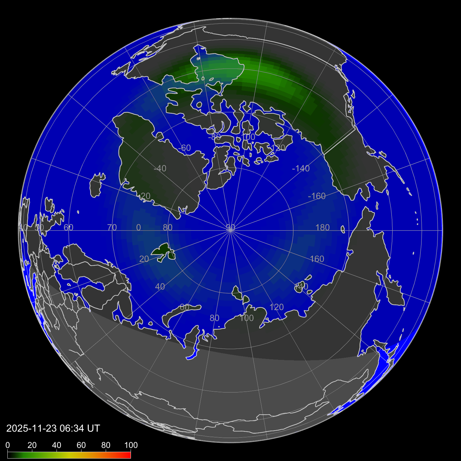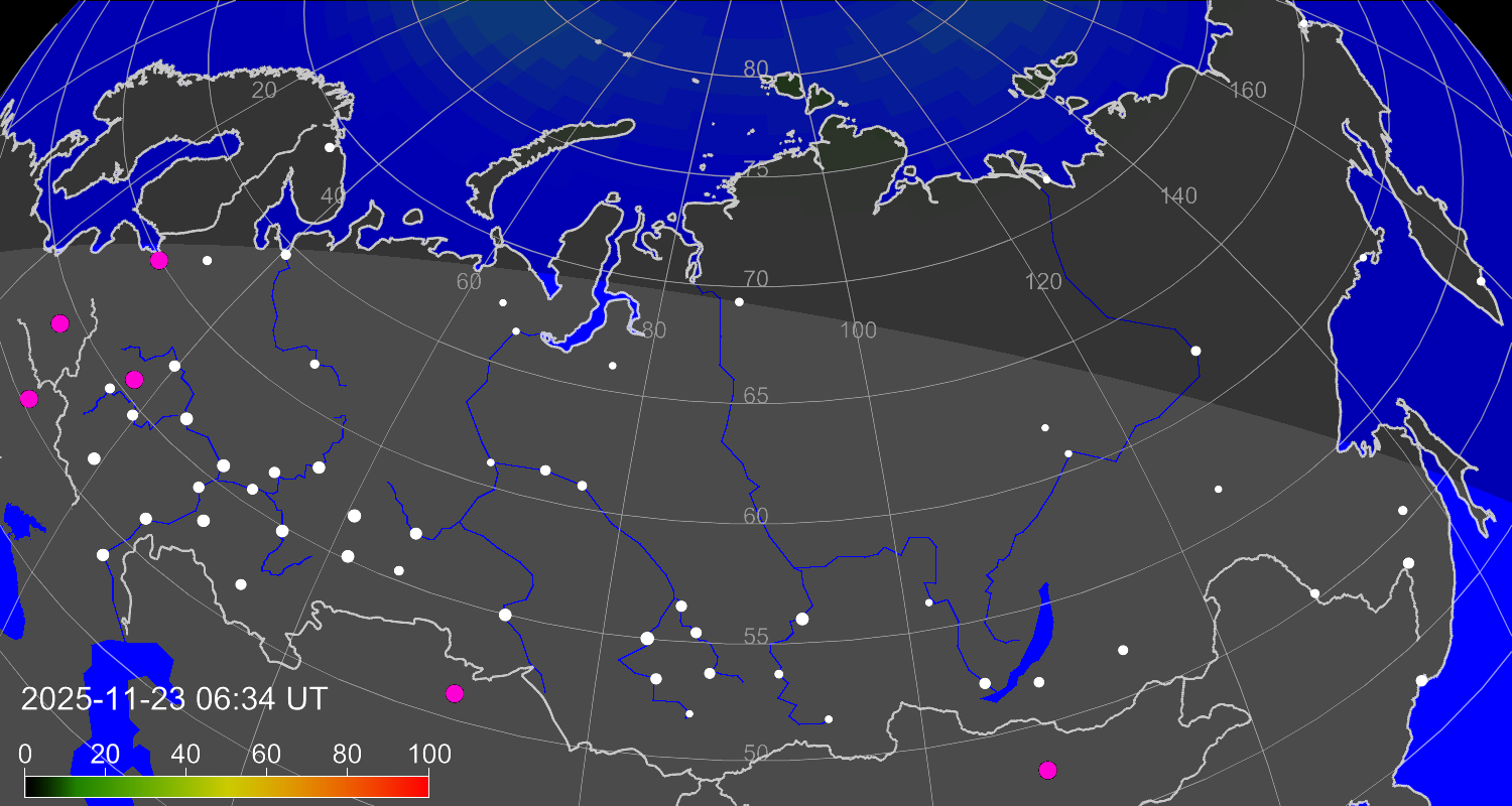 Индекс интенсивности полярных сияний и теоретически возможная широта наблюдений для ночного времени в восточном полушарии