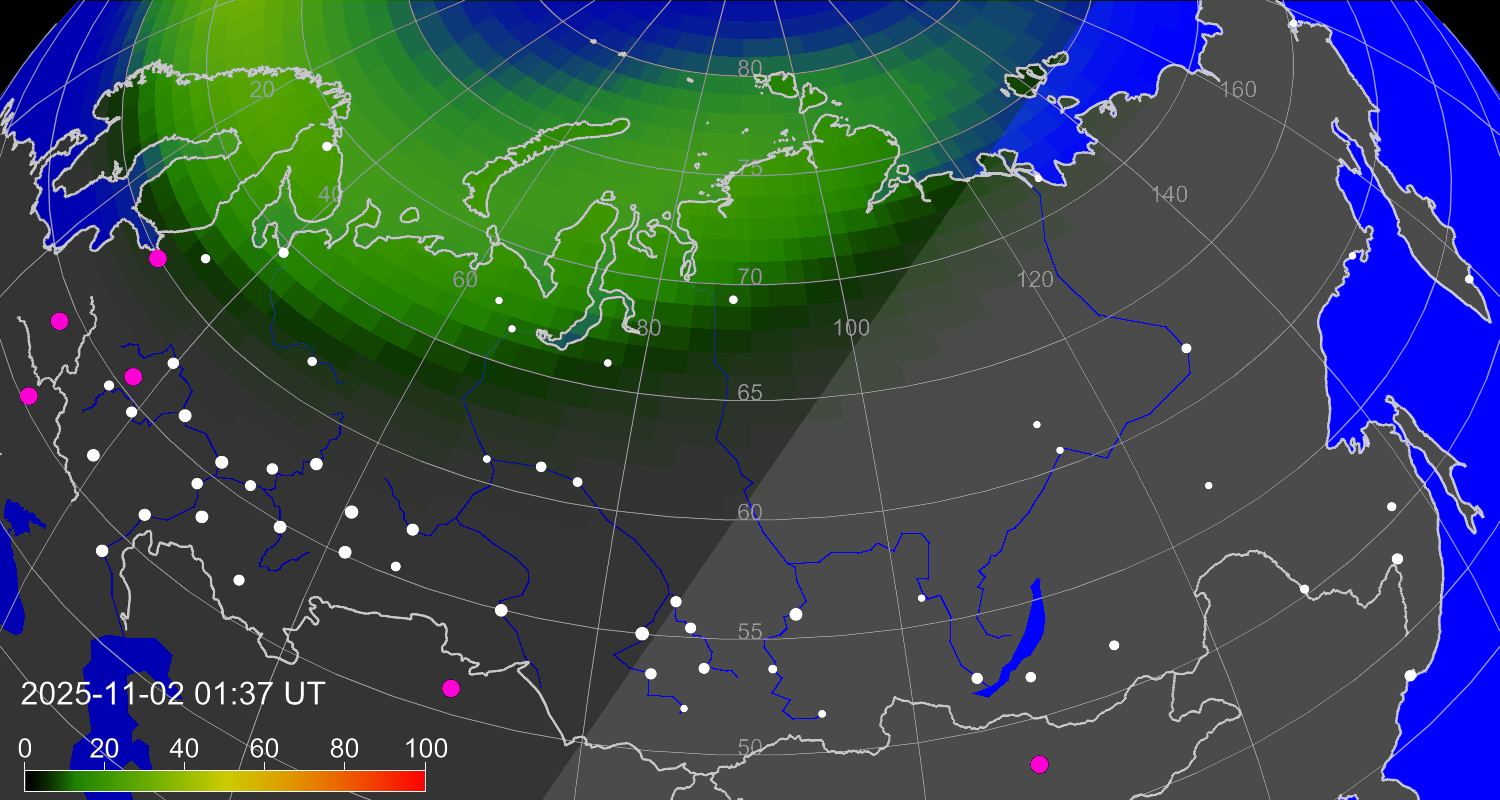 Изменения и часовой прогноз индекса интенсивности полярных сияний с 2025-11-01 по 2025-11-02