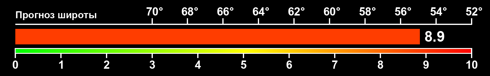 Индекс интенсивности полярных сияний и теоретически возможная широта наблюдений для ночного времени в восточном полушарии по состоянию на 2026-04-02 23:59 (конец дня) по местному времени