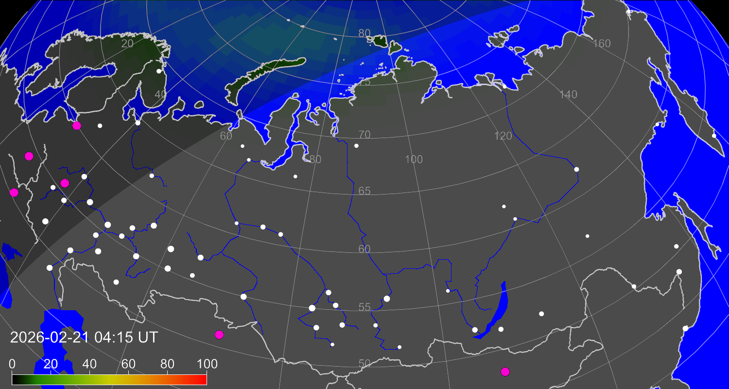Индекс интенсивности полярных сияний и теоретически возможная широта наблюдений для ночного времени в восточном полушарии