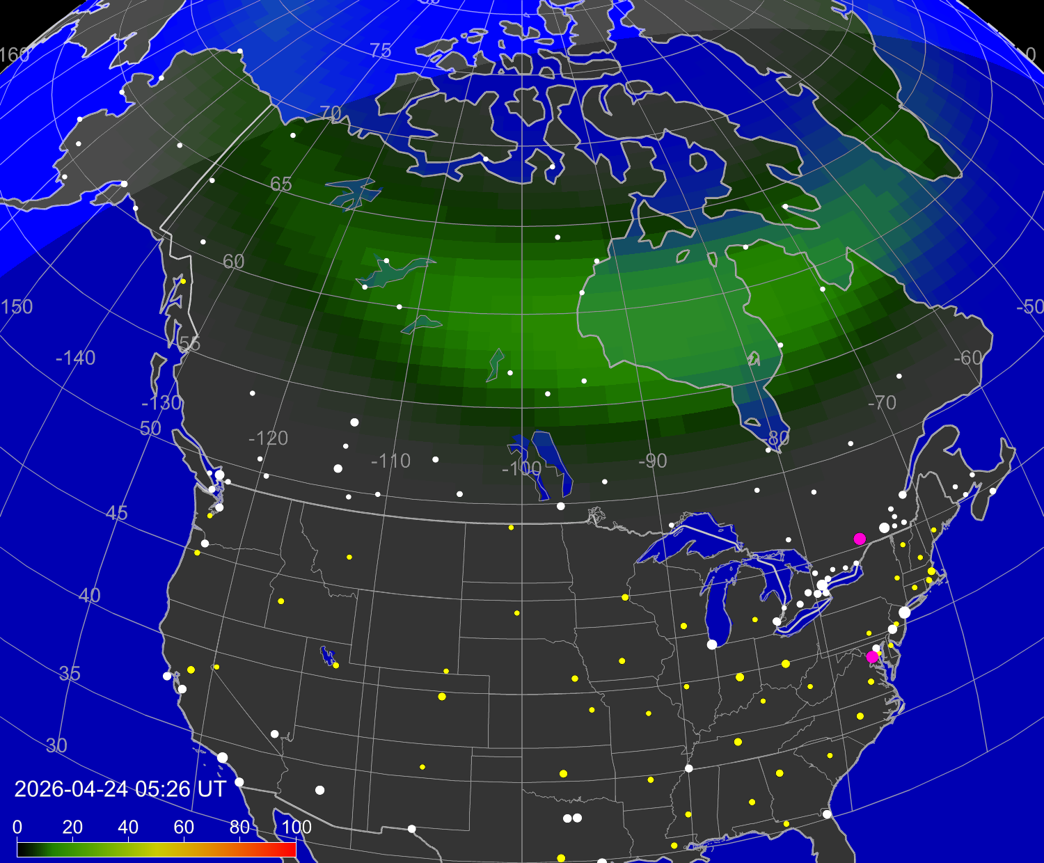 Вероятность полярных сияний в городах Канады