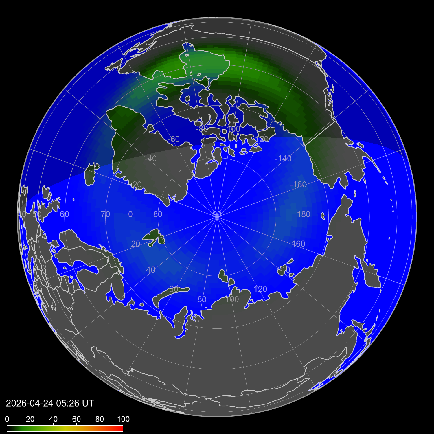 Индекс интенсивности полярных сияний и теоретически возможная широта наблюдений для ночного времени в западном полушарии