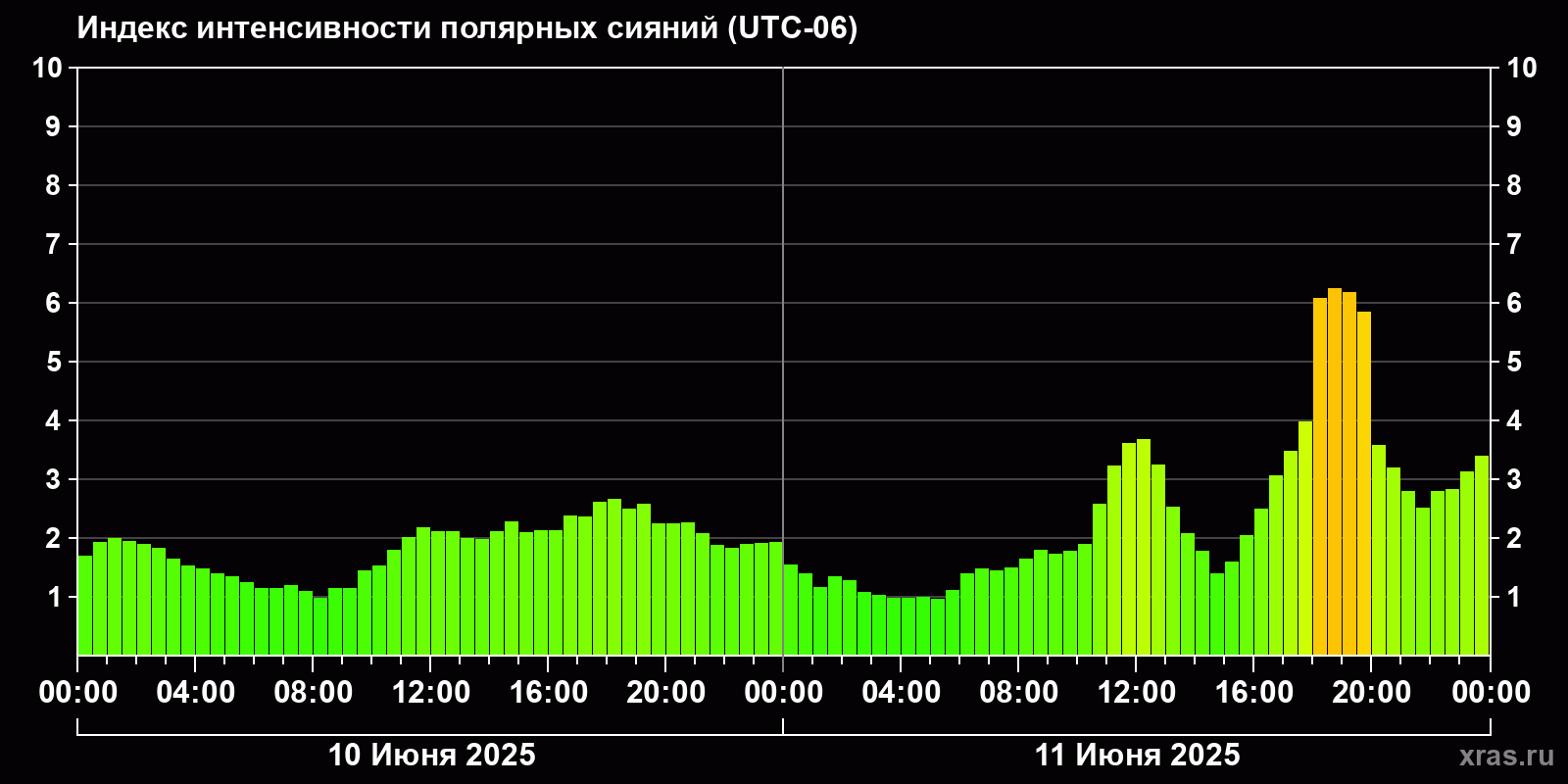 Изменения индекса интенсивности полярных сияний с 2025-06-10 по 2025-06-11 по местному времени