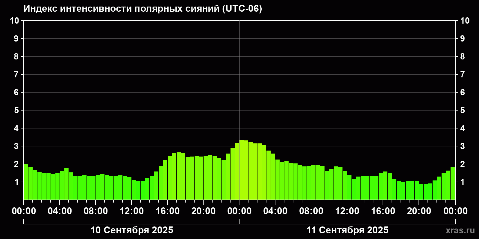 Изменения индекса интенсивности полярных сияний с 2025-09-10 по 2025-09-11 по местному времени