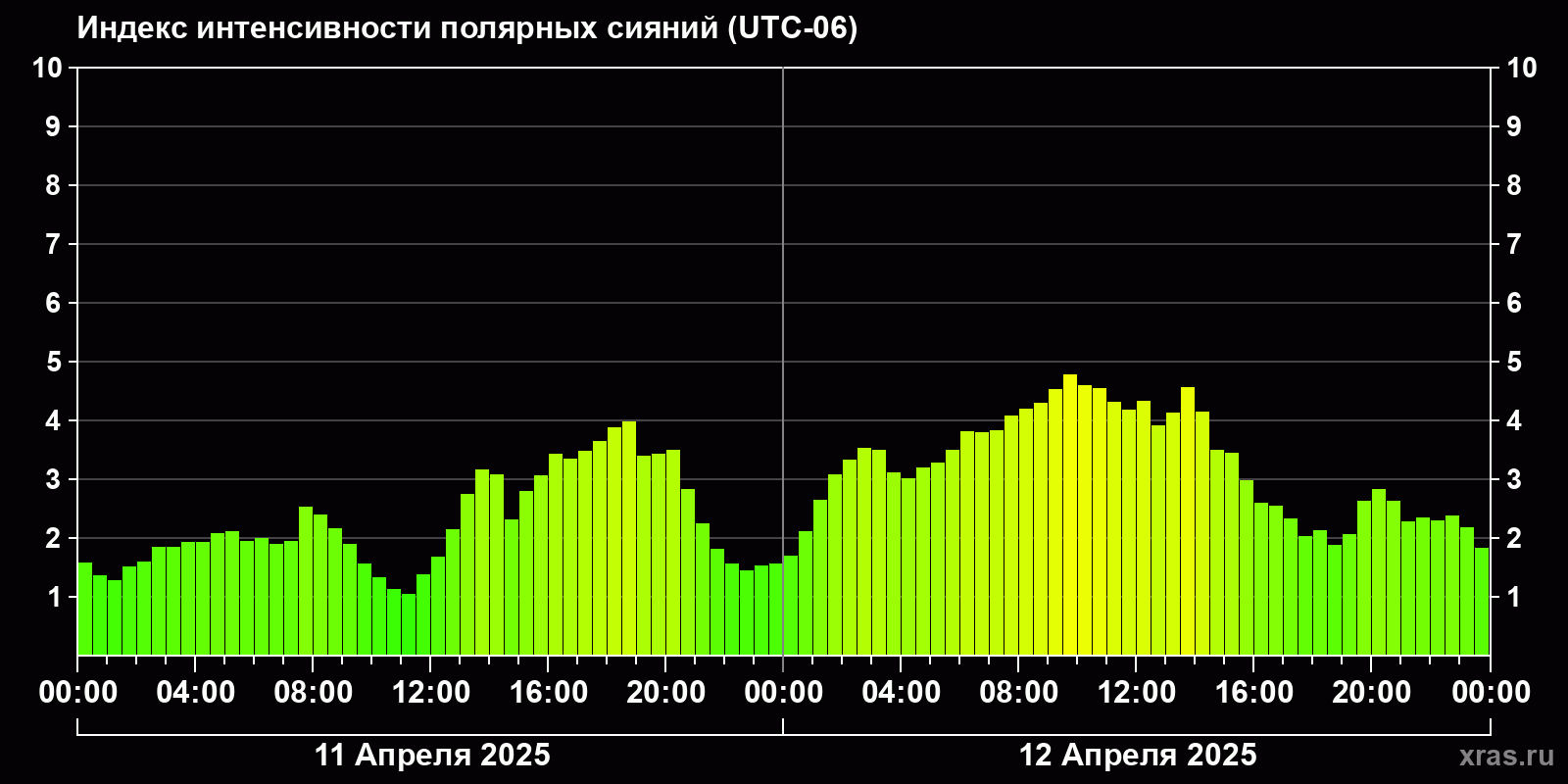 Изменения индекса интенсивности полярных сияний с 2025-04-11 по 2025-04-12 по местному времени