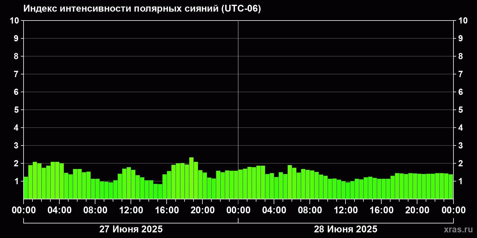 Изменения индекса интенсивности полярных сияний с 2025-06-27 по 2025-06-28 по местному времени