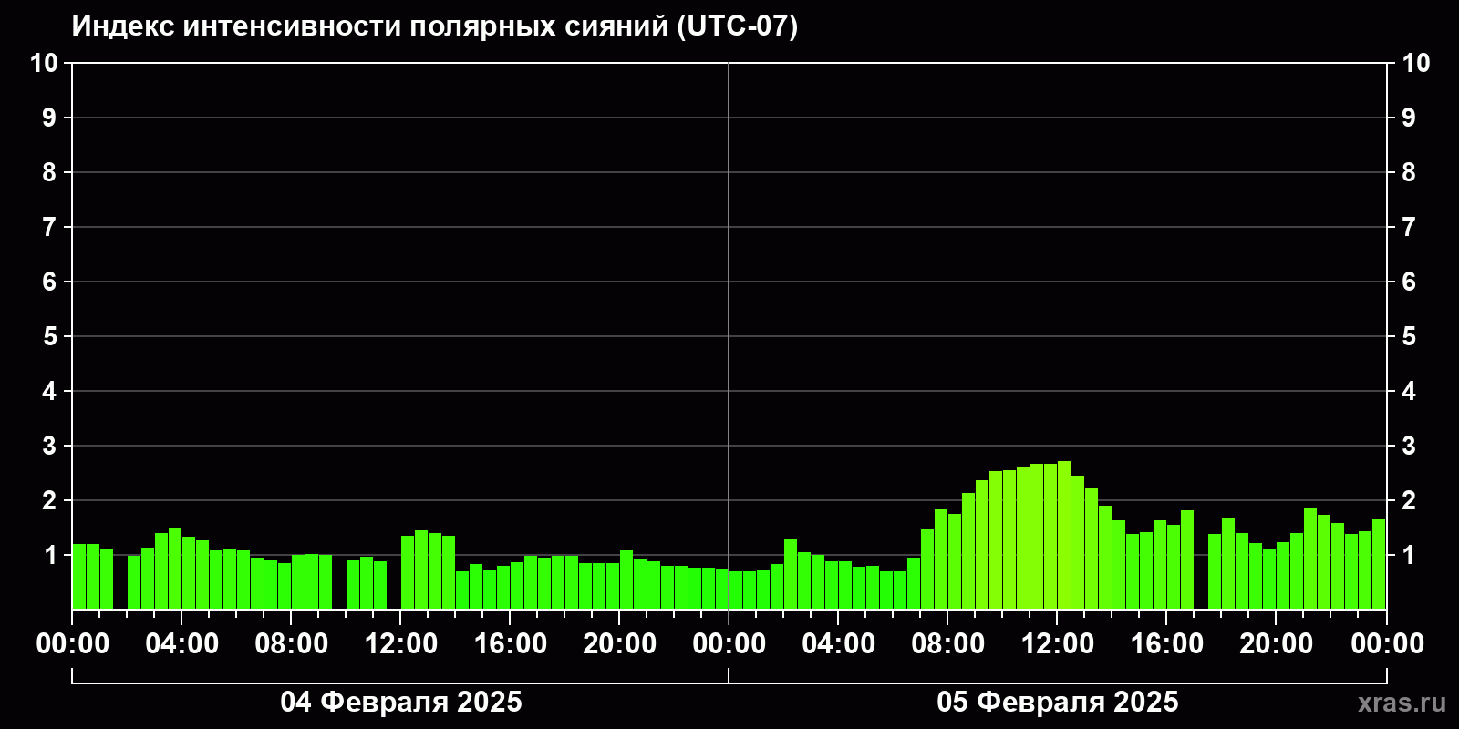 Изменения индекса интенсивности полярных сияний с 2025-02-04 по 2025-02-05 по местному времени