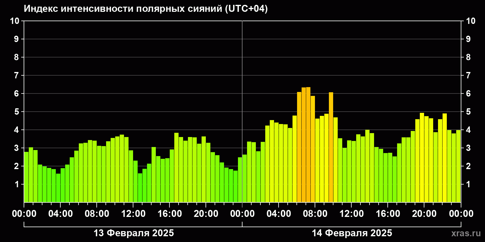 Изменения индекса интенсивности полярных сияний с 2025-02-13 по 2025-02-14 по местному времени