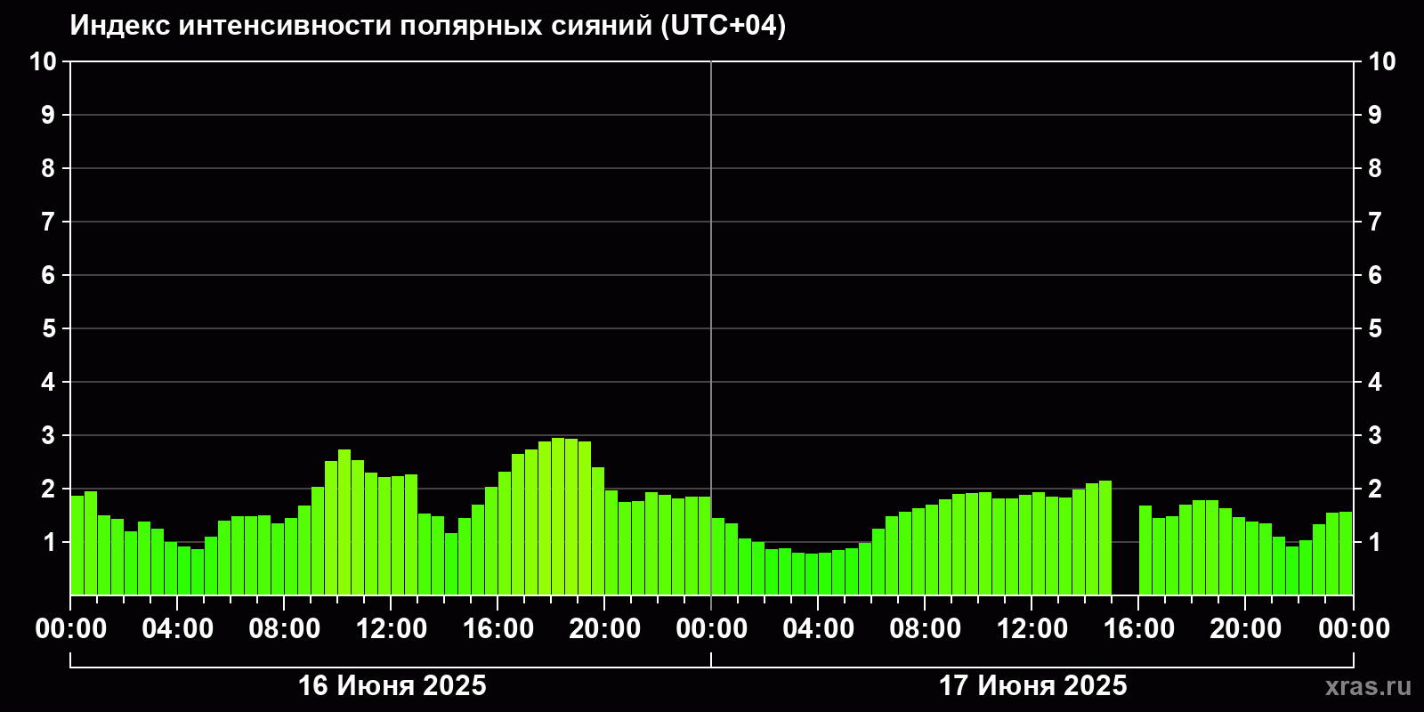 Изменения индекса интенсивности полярных сияний с 2025-06-16 по 2025-06-17 по местному времени