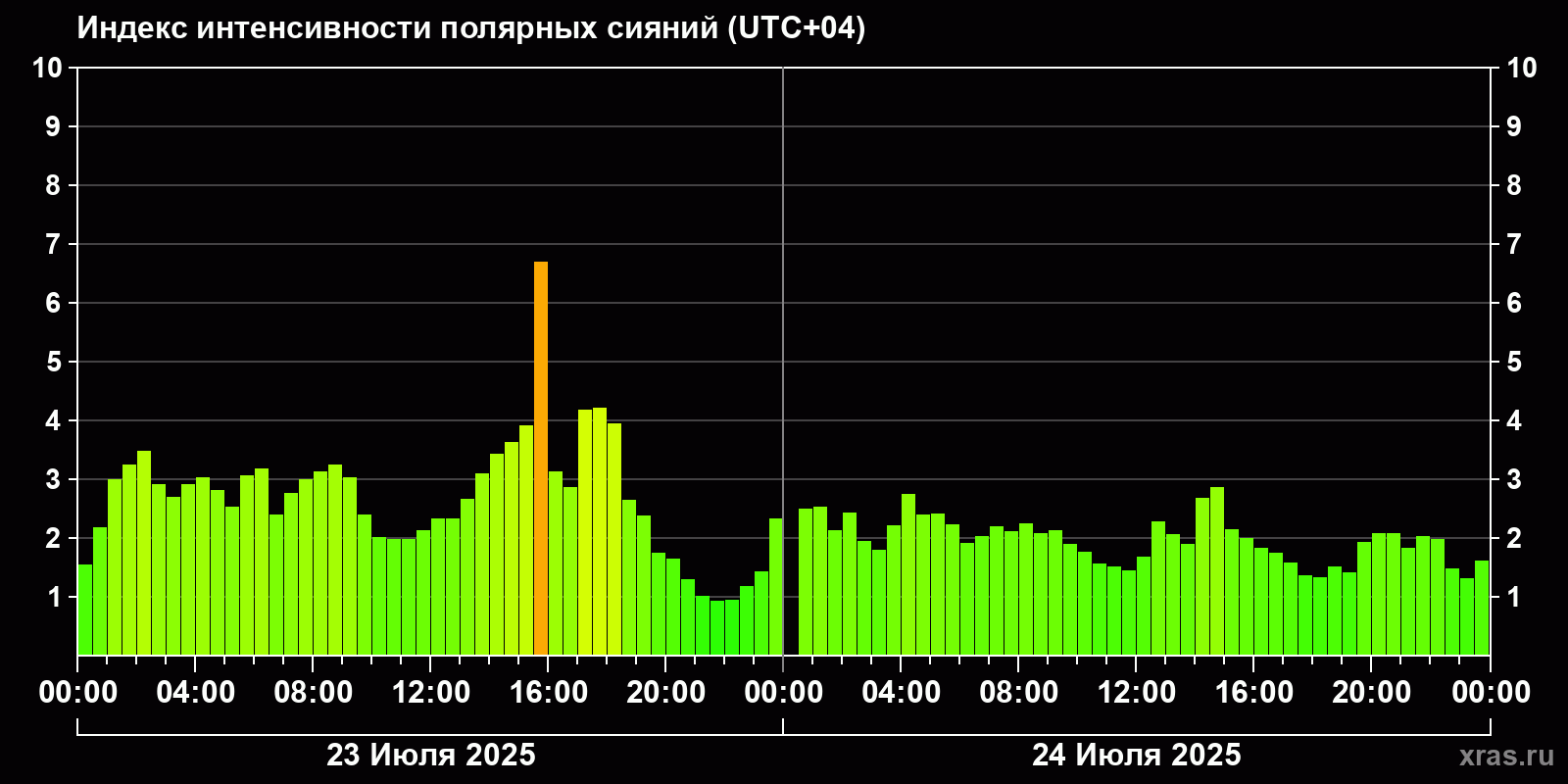 Изменения индекса интенсивности полярных сияний с 2025-07-23 по 2025-07-24 по местному времени