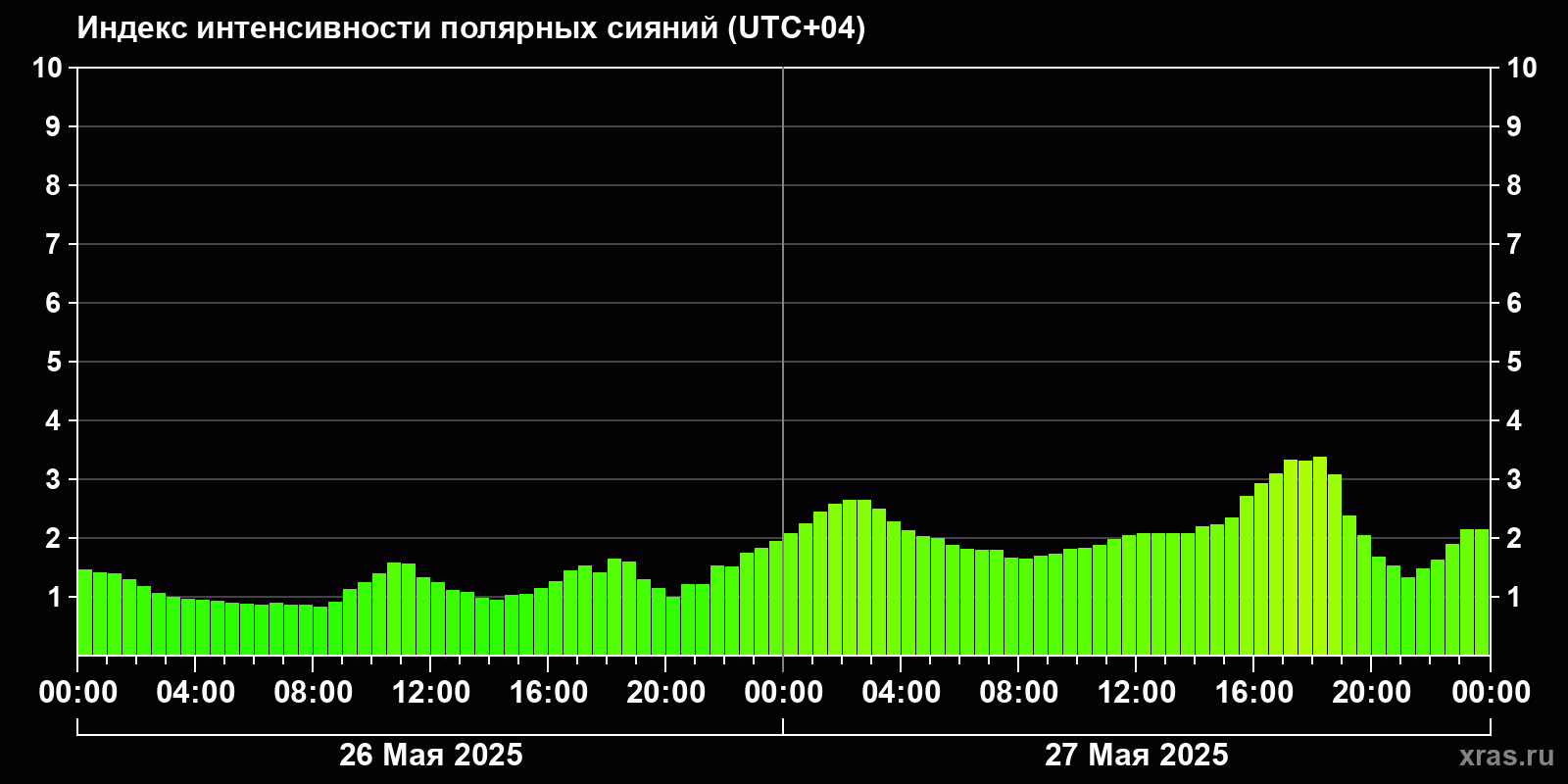 Изменения индекса интенсивности полярных сияний с 2025-05-26 по 2025-05-27 по местному времени