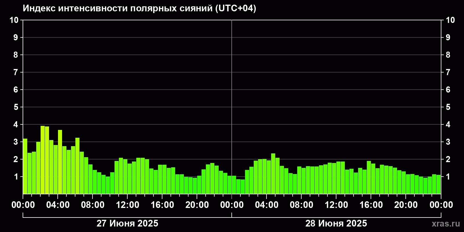 Изменения индекса интенсивности полярных сияний с 2025-06-27 по 2025-06-28 по местному времени