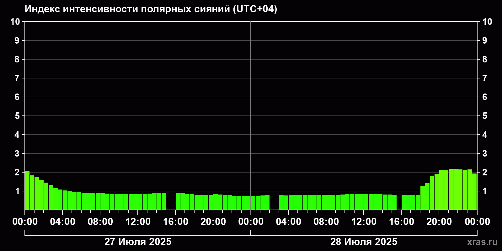 Изменения индекса интенсивности полярных сияний с 2025-07-27 по 2025-07-28 по местному времени