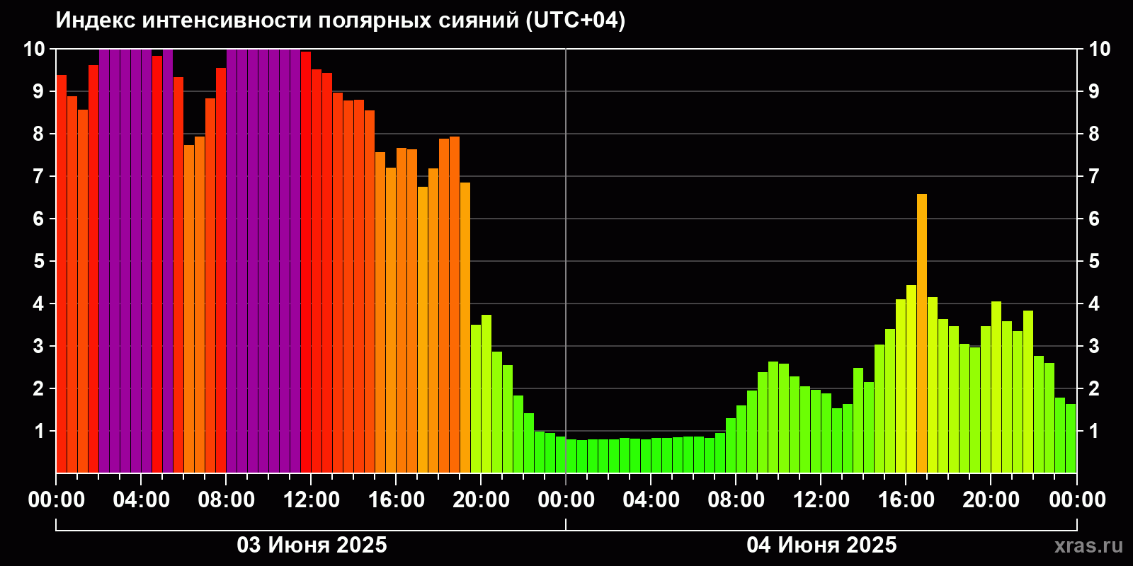 Изменения индекса интенсивности полярных сияний с 2025-06-03 по 2025-06-04 по местному времени