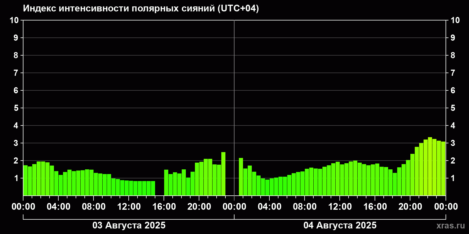 Изменения индекса интенсивности полярных сияний с 2025-08-03 по 2025-08-04 по местному времени