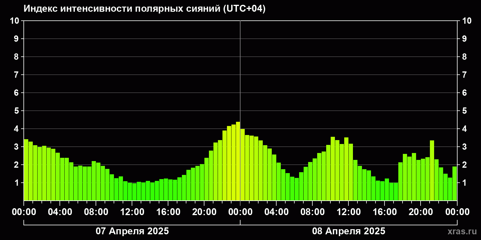 Изменения индекса интенсивности полярных сияний с 2025-04-07 по 2025-04-08 по местному времени