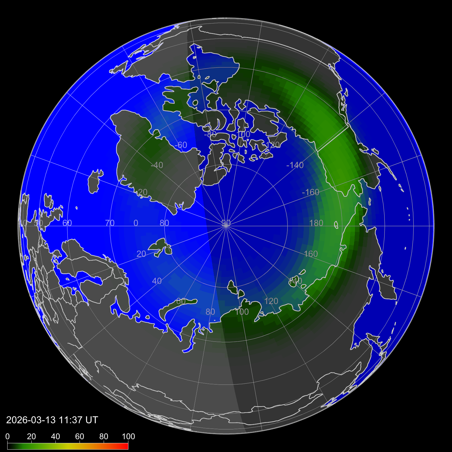 Изменения и часовой прогноз индекса интенсивности полярных сияний с 2026-03-11 по 2026-03-12