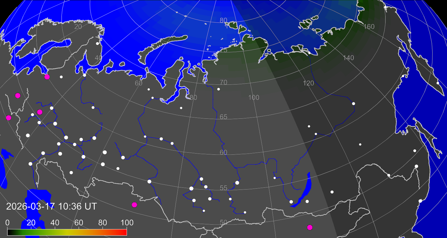 Вероятность полярных сияний в городах Российской Федерации