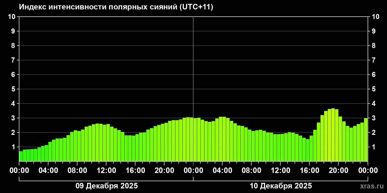 Изменения индекса интенсивности полярных сияний с 2025-12-09 по 2025-12-10 по местному времени