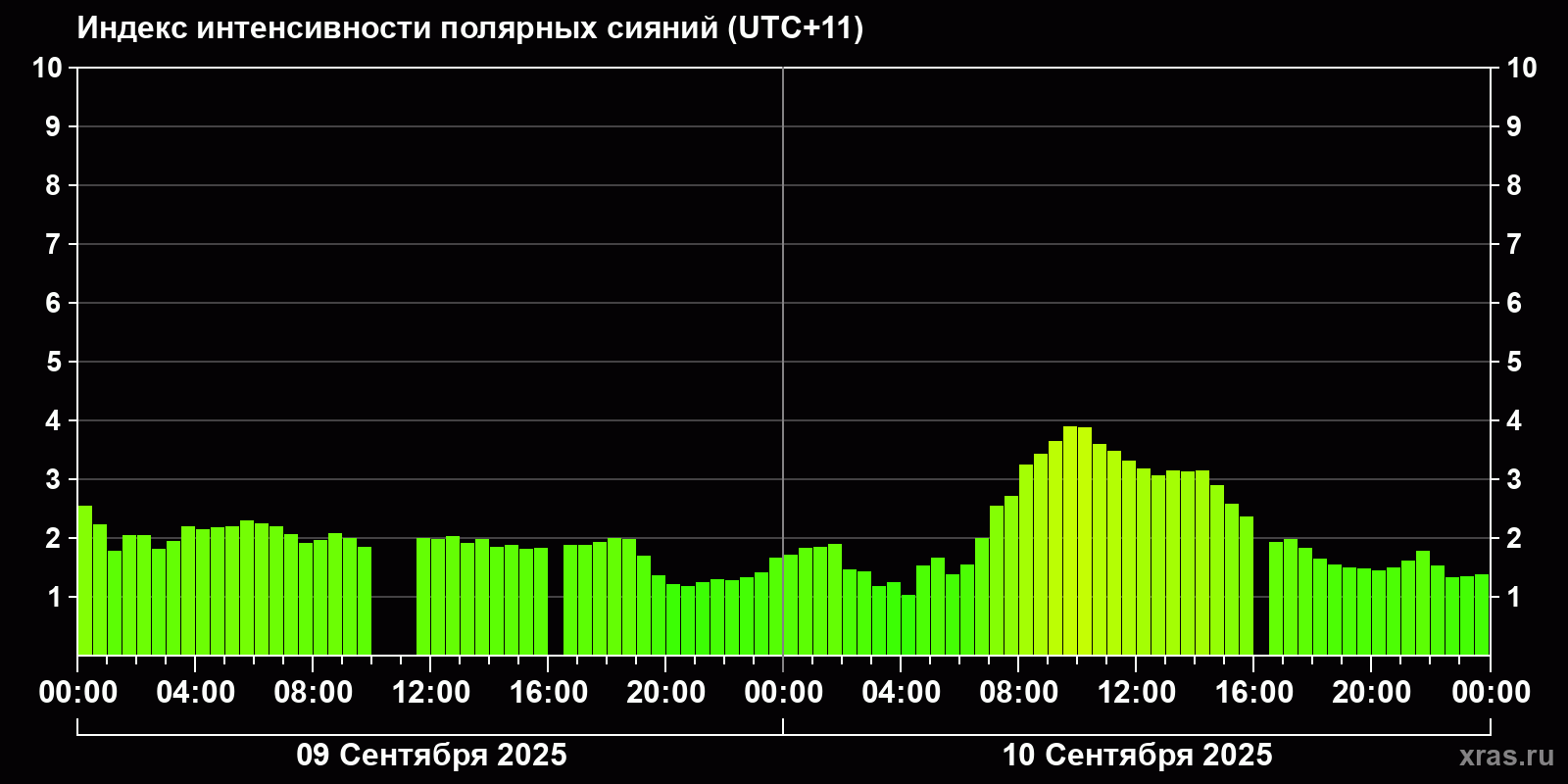 Изменения индекса интенсивности полярных сияний с 2025-09-09 по 2025-09-10 по местному времени