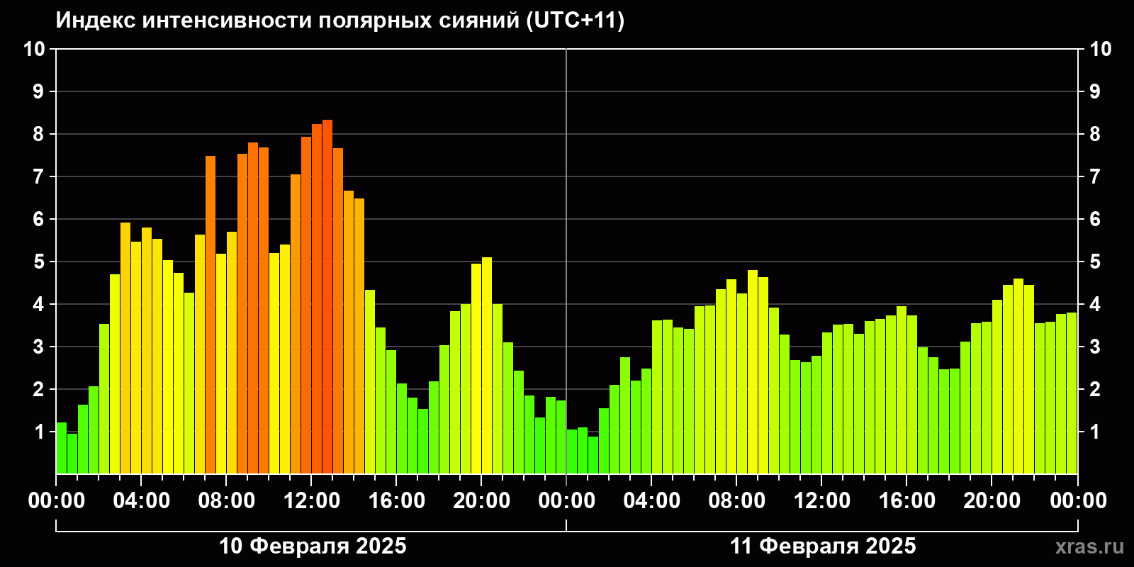 Изменения индекса интенсивности полярных сияний с 2025-02-10 по 2025-02-11 по местному времени