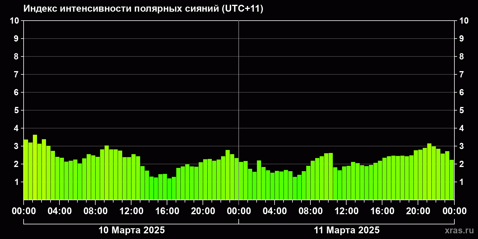 Изменения индекса интенсивности полярных сияний с 2025-03-10 по 2025-03-11 по местному времени