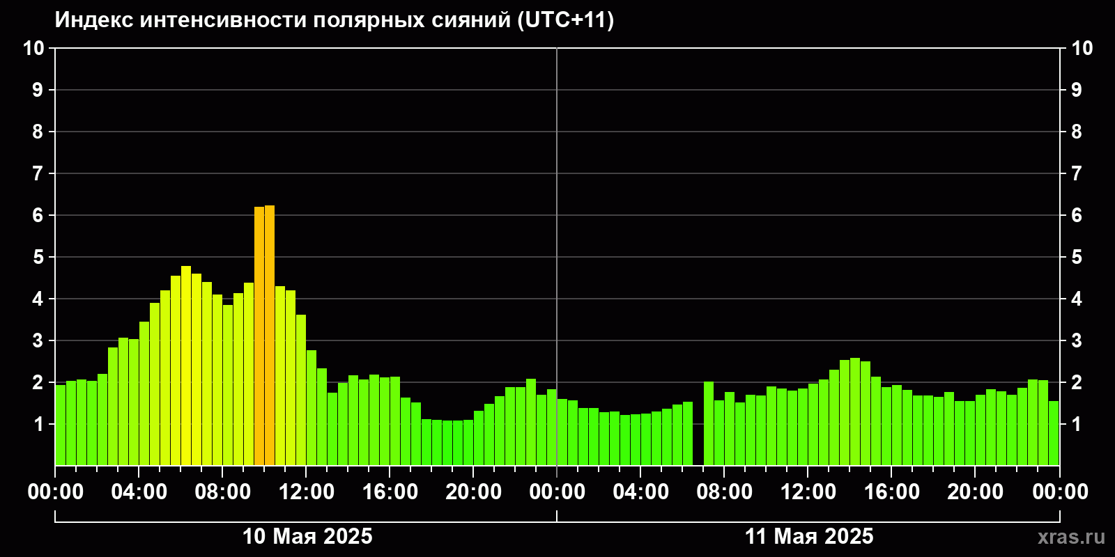 Изменения индекса интенсивности полярных сияний с 2025-05-10 по 2025-05-11 по местному времени