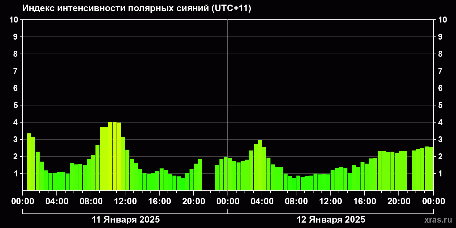 Изменения индекса интенсивности полярных сияний с 2025-01-11 по 2025-01-12 по местному времени