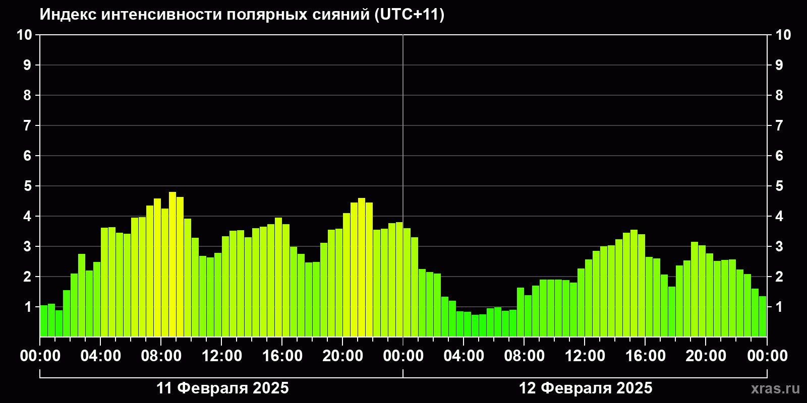 Изменения индекса интенсивности полярных сияний с 2025-02-11 по 2025-02-12 по местному времени