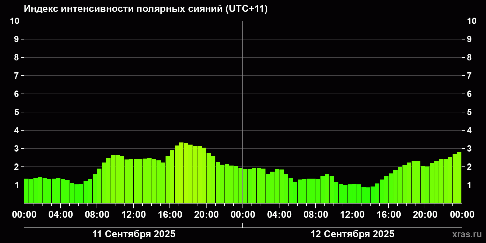 Изменения индекса интенсивности полярных сияний с 2025-09-11 по 2025-09-12 по местному времени