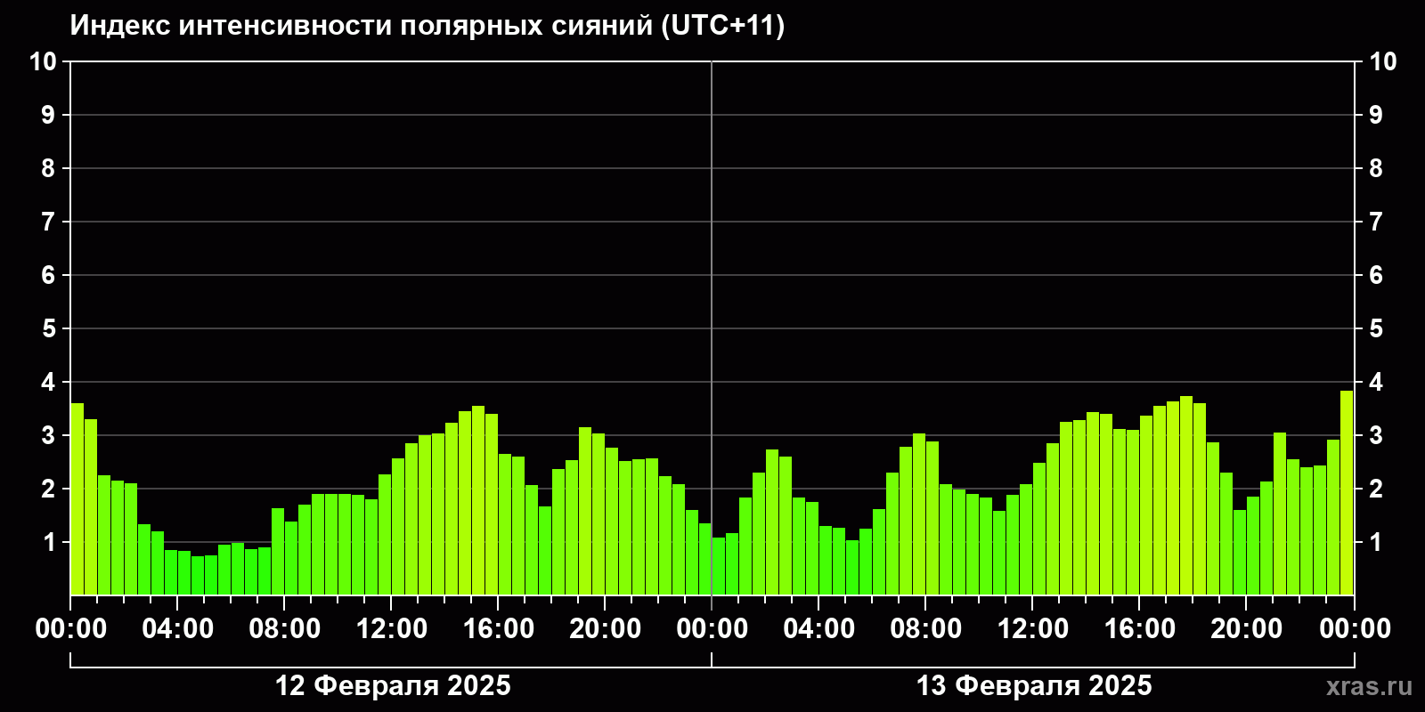 Изменения индекса интенсивности полярных сияний с 2025-02-12 по 2025-02-13 по местному времени