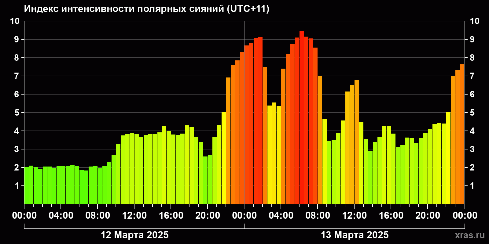 Изменения индекса интенсивности полярных сияний с 2025-03-12 по 2025-03-13 по местному времени