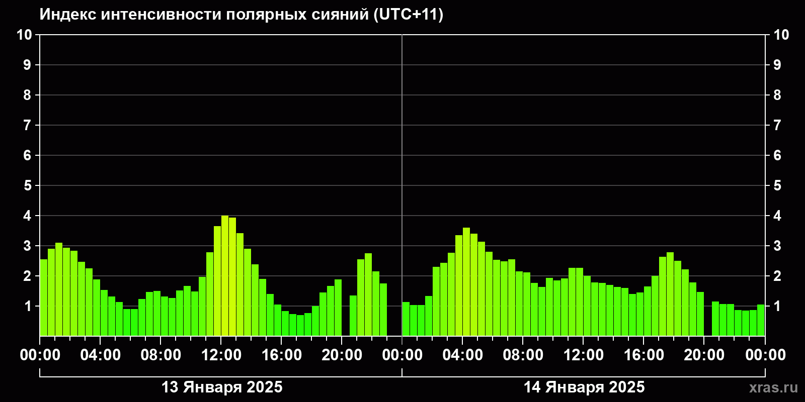 Изменения индекса интенсивности полярных сияний с 2025-01-13 по 2025-01-14 по местному времени