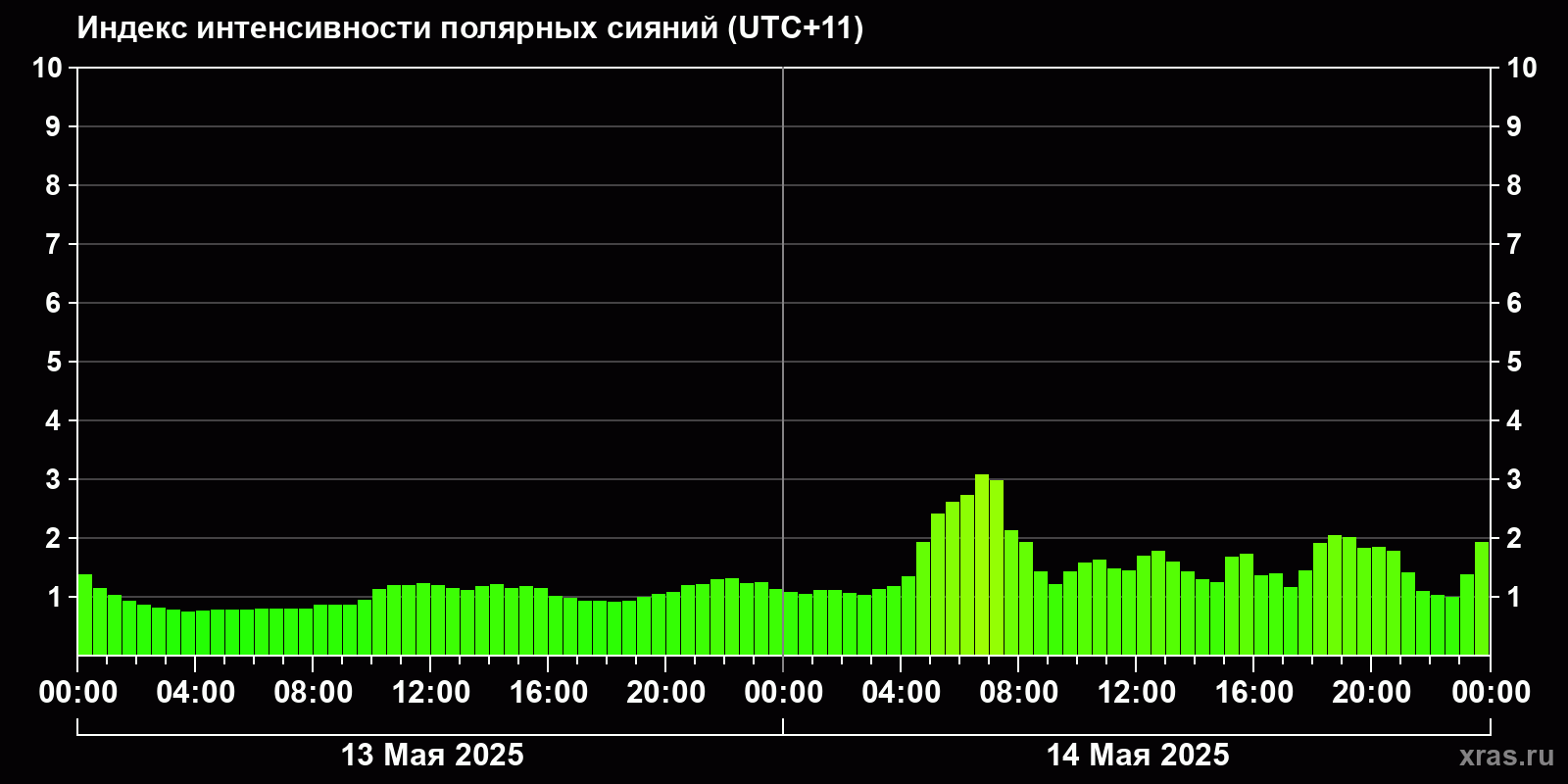 Изменения индекса интенсивности полярных сияний с 2025-05-13 по 2025-05-14 по местному времени