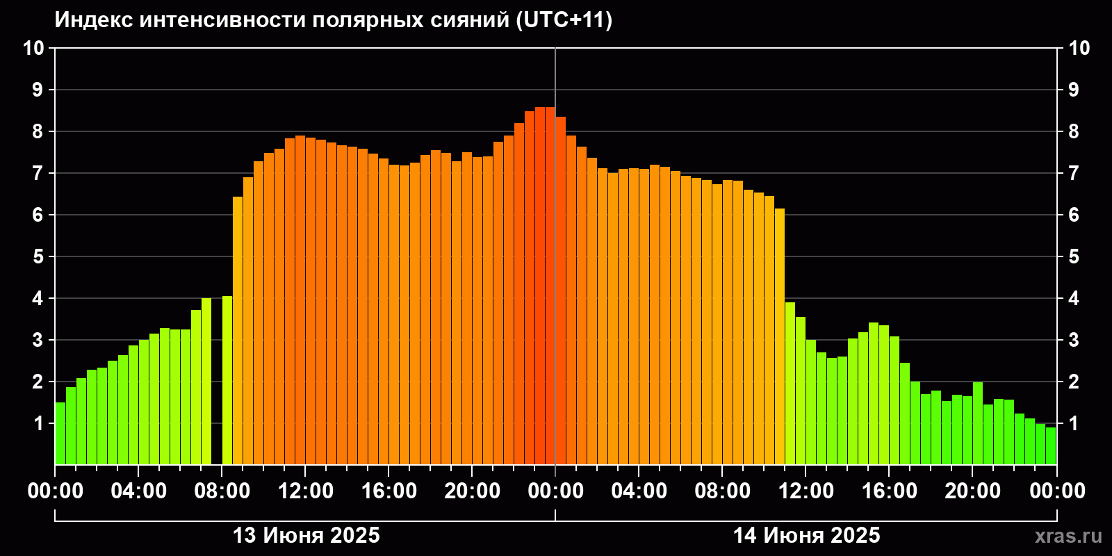Изменения индекса интенсивности полярных сияний с 2025-06-13 по 2025-06-14 по местному времени