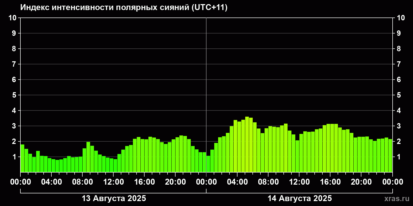 Изменения индекса интенсивности полярных сияний с 2025-08-13 по 2025-08-14 по местному времени
