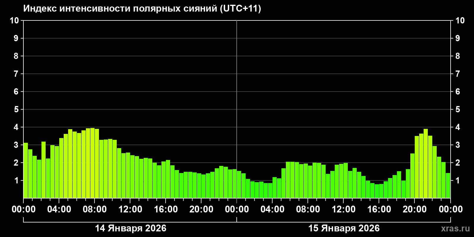 Изменения индекса интенсивности полярных сияний с 2026-01-14 по 2026-01-15 по местному времени